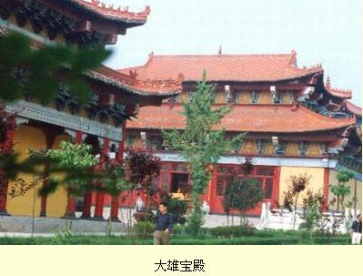 第二进大雄宝殿,中间有三尊大佛均为丈二金身,背后塑海岛观音,殿内两侧分立18罗汉,后为文殊、普贤。