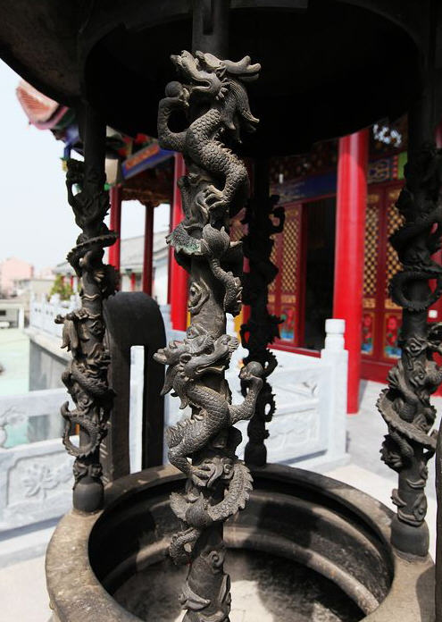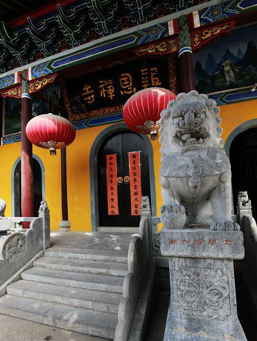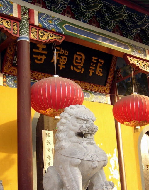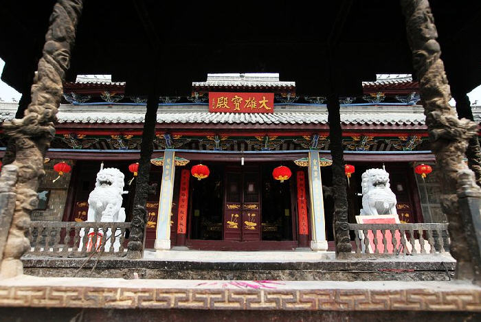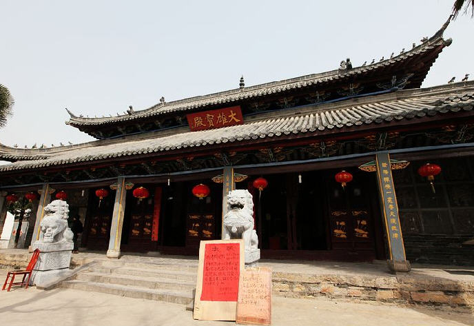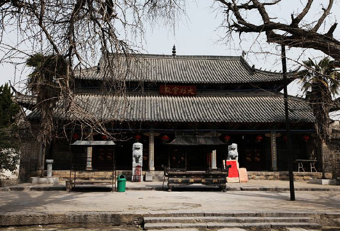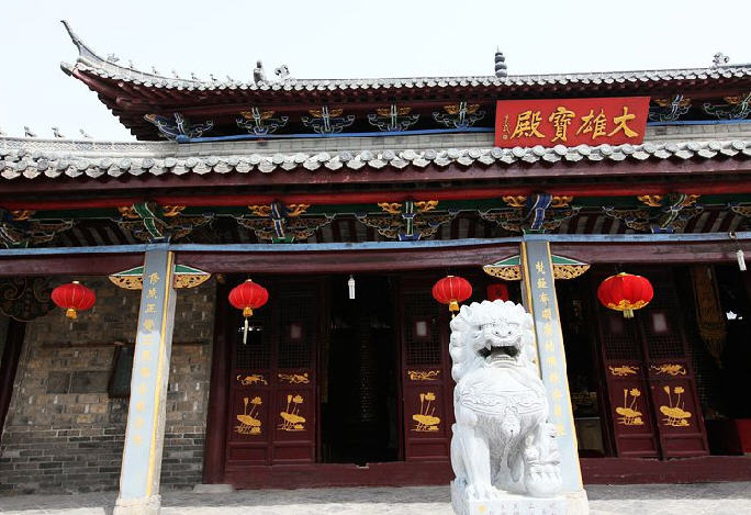 飞角流丹的大雄宝殿,是报恩寺的主建筑物,建在一米多高的石基上,更显威严庄重。殿面五间,进深三间,殿门前有长廊, 立石质方形廊柱,柱面有花乌浮雕,门东一柱础上有“石羊抵头,画面,生动逼真,此为“寿州内八景”之一景。大殿内东、西、 北三面是省级重点保护文物泥塑十八罗汉和唐、宋、明、清四代 的木雕、铜铸造像等几十尊,神态各异,栩栩如生。进入殿门,正中摆放着半人高的铜香炉,你别小看它,州人都知道这叫“城里城此亦为内八景中之一景。大殿门两旁墙上嵌着大书法家赵盂 倾所书的“南无释迎牟尼佛”七个大字和清书法家梁嫩为此七字 作跋的两方石刻。大殿东侧是僧祖堂及涤尘精舍,两侧是禅堂、维那寮。