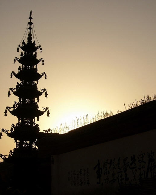 信步东禅寺, 夕阳古塔尖。院深藏野竹, 垣矮如远山。