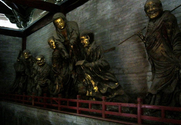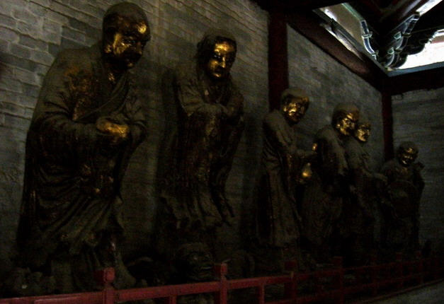 铜铸十八罗汉 铜铸十八罗汉,原在县城北门内圆通寺,1962年移入报恩寺。现存15尊。这些造像体积不大(通高63—67厘米),但神情意态栩栩如生,其造型则表现出简练浑厚的特点。由像背刻字知其铸造年代为明万历三十三到三十五年(1605—1607)。1961年6月9日,安徽省文化局公布这些造像为省重点保护文物。