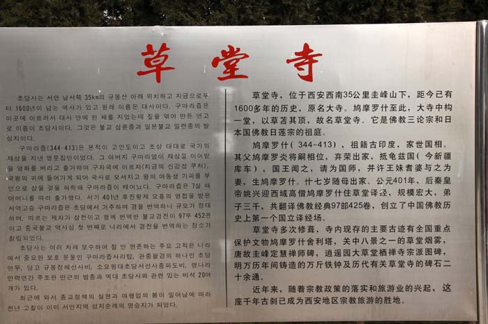 草堂寺位于陕西省户县圭峰山北麓,距西安约五十公里,是国务院确立的汉族地区佛教全国重点寺院。该寺约创建于东晋末年,距今一千五百多年。这里东临沣水,南对终南山圭峰、观音、紫阁、大顶诸峰,景色秀丽。草堂寺内松柏参天,翠竹轻拂,亭阁玲珑,意境幽邃。它是佛教著名古刹,也是三论宗祖庭。