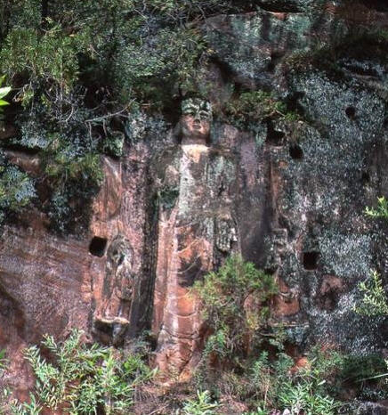 摩崖大佛位于洞窟右侧约5米处的崖壁上,高约4米,立姿,身着宽大的褒衣博带袈裟,衣纹刻划的写实感较强。大佛两侧还各有1尊胁侍菩萨立像。
