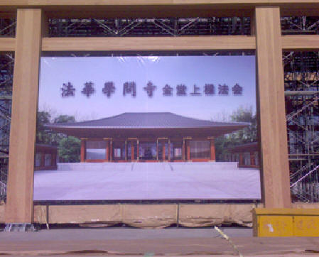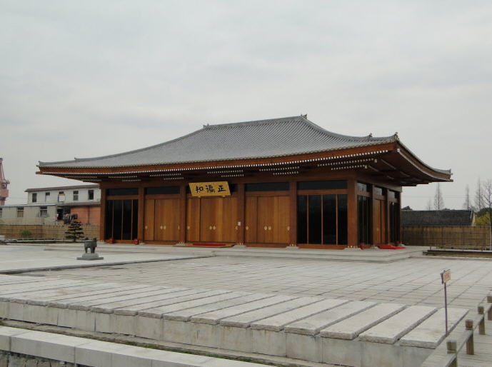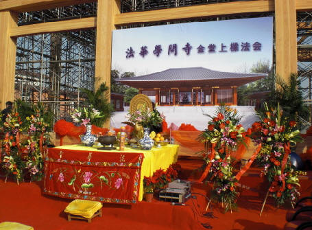 当上海世博会在浦江两岸辉煌登场之时,法华学问寺也已初具规模。法华学问寺坐北朝南,西侧毗邻黄浦江,主入口位于寺院东侧,以简朴的木篱作为山门。入寺内,前院主体建筑大雄殿,即新唐风的金堂已屹立于斯。金堂不回避现代科技的建材使用,屋顶采用庑殿式单檐结构,弧面宽舒,沉降为疏阔飞檐,其下有木条经纬,银灰色陶瓦,结为法华学问寺梵文标志的贴金瓦当,在长条闽南花岗石基石上是五开间的木构殿身。大殿以层叠方木代替斗拱,室内用双曲面拱顶,门窗采用落地玻璃和实木推门,四个转角也采用落地镀膜玻璃,使殿外景致与大殿的内外空间融为一体。金堂内采用唐式(日韩流行)的草垫榻地板,殿正中分列从原寺内移来的“华严三圣”释迦、文殊、普贤三尊彩绘菩萨像。临东侧殿角放置唐式仿古钟一座。金堂门上正悬牌匾“正遍知”,这是与“大雄”一样同列佛祖释迦的十大名号之一,采用此称谓亦显现其与众不同,起到发人深思的作用。