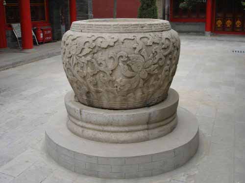 在讲经堂前,有白色大理石莲花缸一个,直径1.4米,下有圆形石座,通高1.5米。缸身遍布莲花绕枝图案,十分精美,径口刻有隶书铭文,是清乾隆时为西安崇圣寺所造,后来移到广仁寺。