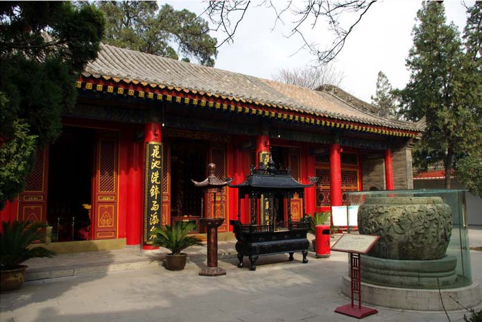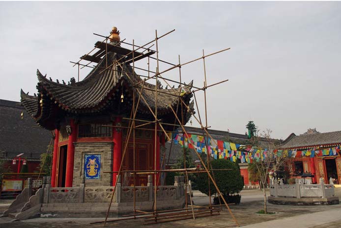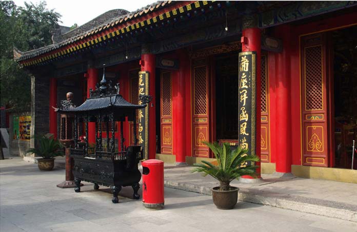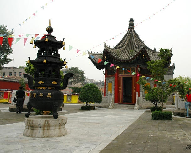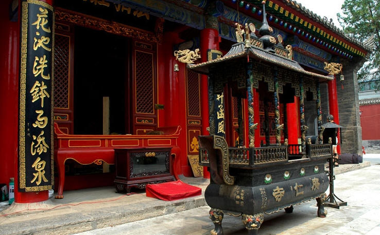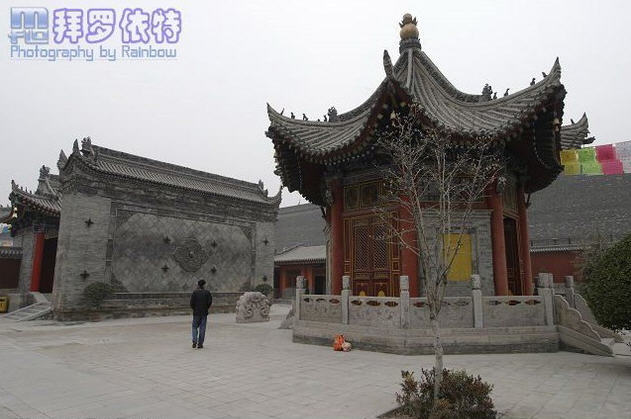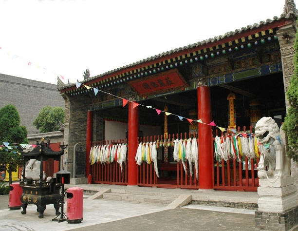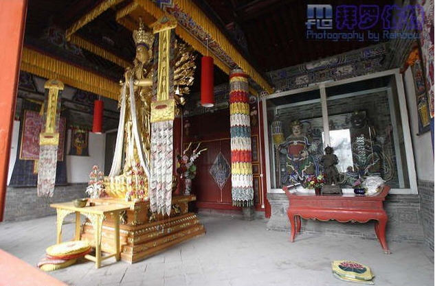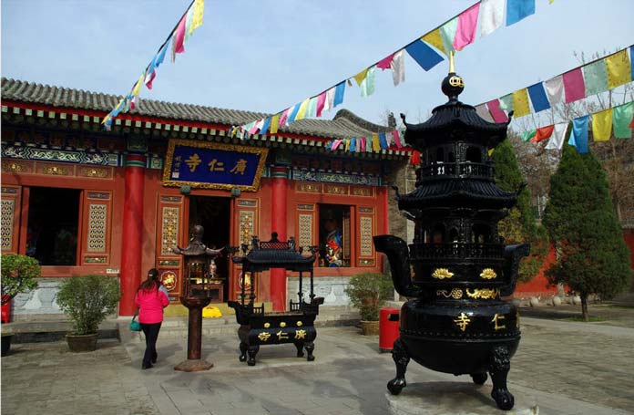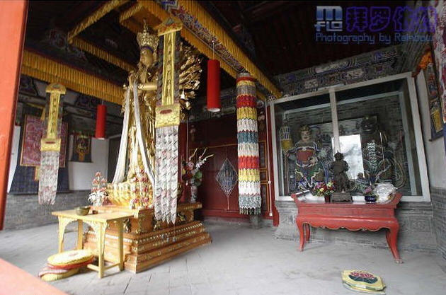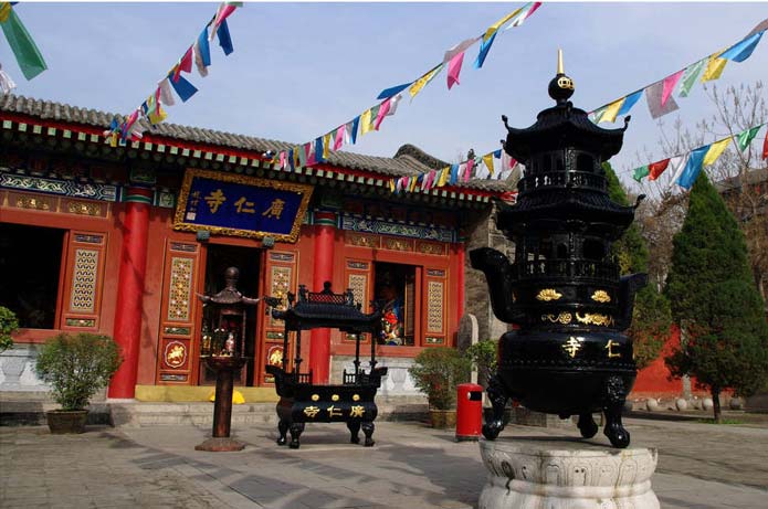 广仁寺占地16亩,寺前有高大的六角攒顶式康熙御碑亭。迈过宏伟的卷棚式屋顶的大门,在院中有一尊铁铸的八卦灯笼。灯内一次可添油108斤,昼夜不熄,称为“万年灯”。红柱碧檐的大殿内,供奉着2米高的观音菩萨坐像,两侧分别是高1.5米的文殊、普贤菩萨坐像,均为唐代鎏金佛像,相传是由唐开元寺中移来的。
