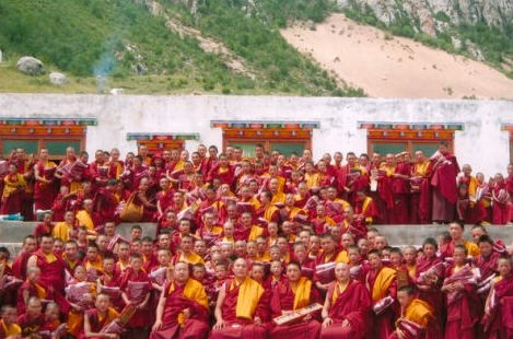 全体僧众在觉拉山闭关房前与阿丁朋措仁波切及大堪布合影