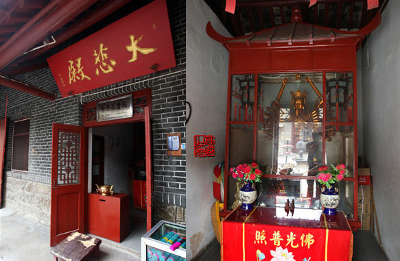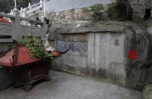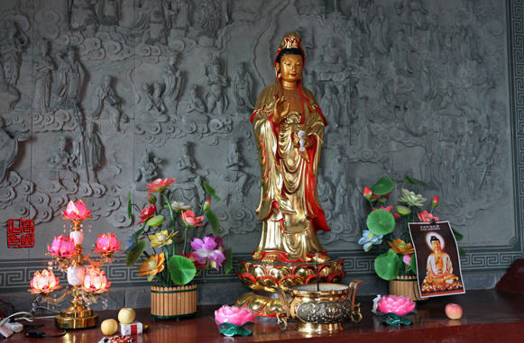 园通宝殿两侧抱拄,刻有“慈云无住庄严像,法雨常飞清静身”,为当年乾隆皇帝游大士岩寺时亲笔手书。园通宝殿横梁上有“普陀一支”四字,是大士岩寺为普陀山下院的例证。
