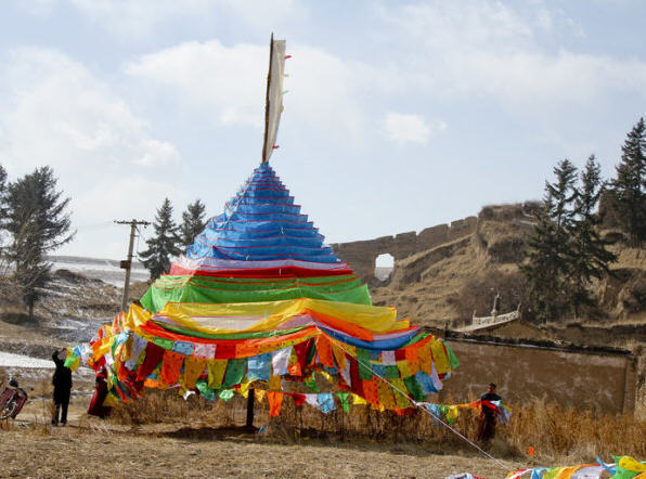 广惠寺周围土地开阔平坦,良田活野相间。过去,寺的左侧是“大拉郎”花园,占地20余亩;对面是“布拉浪”花园,占地10余亩。园内苍松翠柏,白杨杂柳,虬枝横出,疏密相间,覆盖其上;涓涓溪流,潺潺泉水,滚珠溅玉,时隐时现,迂回其间。造形奇特、别具匠心的“麻尼”磨端然肃立,五光十色、万紫千红的野花香味阵阵扑鼻。鹊鸣疏枝,燕舞晴空,彷佛置身于图画之中。右侧是平地兀起、气势雄伟的三层碉楼,直插云霄,使人顿生“壁垒森严”之感。千亩平台,群众称其为“鹞子沟台”,与寺门遥遥相对。静观碧水东流去,喜的松涛盈耳来,别有一番风味。寺后一段山峦,各具形态,犹为奇特,既有遮天蔽日、阴森肃穆的千年老林,也有刀削斧劈、怪石嶙刚的悬崖峭壁,还有绿草茵茵、野花斗妍的平缓草坡。古人当时选择此处建寺,实为独具慧眼。