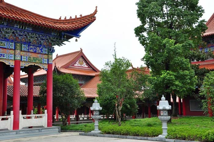 正在建设的开福寺是一组以明清古代皇家寺院风格为主的建筑群,红墙金黄琉璃瓦,降红水泥漆,贴金花饰,富丽而高雅,室内铺传统金砧(大方砖),兼顾美观和功用。寺庙中轴线殿堂对称,以大山门、山门殿、天王殿、大雄宝殿、藏经楼为中轴线,其他建筑物次第分布在两侧,庄严而尺度宜人,是北派、南派完美结合的仿古建筑。主体建筑之间均有长廊相连,便于闻板早课,不受风雨之累,使得各个独立的建筑之间又有了有机的联系。寺庙东侧设计成园林区,叠山置游廊、小亭,可供香客、游人赏游,方便游人休息,并设素斋厅、茶室等设施。寺庙的西侧是修行区只限僧人进入,香客、游人均不得入内,有念佛堂、佛学院、僧寮、退居寮、云水楼等相关设施。整个寺院的每个建筑都有独立院落,相互联系又各成体系。