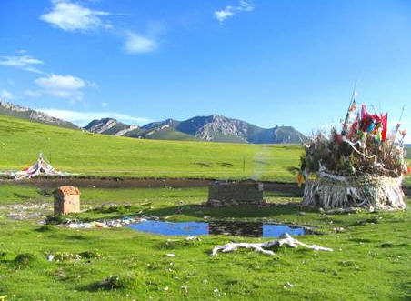 在河南县县城南部四十五公里处吉岗山北麓的尕海滩上,有一片面积约五千平方米的沮洳地,在中央部分的略凸地带有一泓平如明镜、蓝如宝石、清可见底、深约一米的小湖,当地群众称为“拉毛兰木措”,意即仙女湖。仙女湖湖面约十五平方米,泉水清澈凛冽,汇而成湖,出而漫流,形成湖周围的沮洳沼泽。湖水上映蓝天白云,底见碧绿砾石,湖虽不大,却能以净洁、悠远、空冥、神圣之感。清康熙十八年(1679)九月,一世嘉木祥应察罕丹津之请由藏东返创建拉卜楞寺时,与赶来迎接的僧俗一起,为仙女湖诵经祈祷,由此更增加仙女湖宗教色彩。自那以后,世代相传,仙女湖遂即成为当地群众所崇信的圣湖,遂即成为宗教活动的地方。时至今日,过往群众大都驻马临湖瞻仰,或向湖中央投放硬币以示虔敬,以释心愿;或向湖边三脚式幡幢张悬哈达,以造成神秘肃穆气氛。每年四月,附近群众都来这里诵经、膜拜,绕湖“郭拉”;平时遇有病痛灾祸,也来这里磕头、“煨燥”,祈祷神灵降福祛灾。牧民群众逐水草而居,不能常年绕湖膜拜,即在三眼泉流出湖岸的各分流口,安装缠有佛经的嘛呢经轮,藉水转轮,以代口诵,轮转一周,即相当于诵经一遍。水流不息,轮转不止,从而了却常年诵颂“嘛呢”经的心愿。
