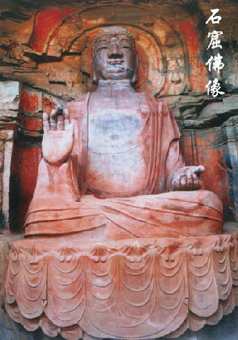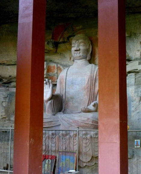 石窟内壁原有半圆雕坐佛像一尊,十年动乱中佛头被打碎,佛身裂为块状。其两侧原有胁侍像,现仅留残迹。坐佛有舟形背光,其顶有浮雕小佛像7尊,现已残缺不全。