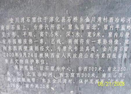 金川湾石窟 金川湾石窟位于淳化县石桥乡金川湾村西侧,是唐代初期建造的刻经石窟。石窟面临冶峪河,背依仲山,山清水秀,林木丰茂,幽谷雅静。唐代以后,这里是一处佛教胜地,宗教文化色彩非常浓郁。在1981年文物普查时,当地文物部门发现了这一刻经石窟。
