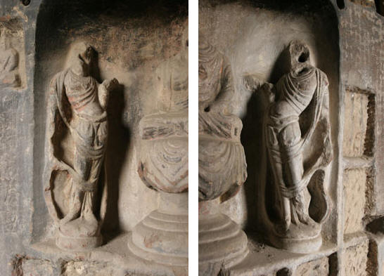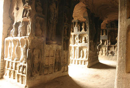 千佛洞为中心柱室结构,由三个相连的小洞组成,两边进深较深,中间为廊柱。窟中现存造像300余尊,除少数为立体外,大部分是浮雕。