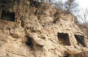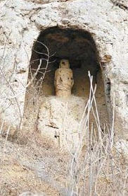 2月4日,记者在附近村民带领下,爬上了位于岐山县蔡家坡镇宋家尧村,一座被当地人叫做“黑风洞”的石山。远远望去,在半山腰的石崖上,几个石窟赫然在目。这些石窟1米见方,有的石窟呈正方形,有的则是上圆下方,其中4个窟内各有佛像一座和七八个不等的陪伺人物雕像,石窟门边左右各有人物或者石狮。最大的石窟除中间雕有一个约2.5米高的大佛外,石窟门边左右各雕有身穿古代衣物的人物。有一个石窟被沙土和柴草掩埋了近一半,窟内从上到下排列着5层佛像,每个小佛像高约15厘米,粗略一数,这些小佛像至少在100个以上。