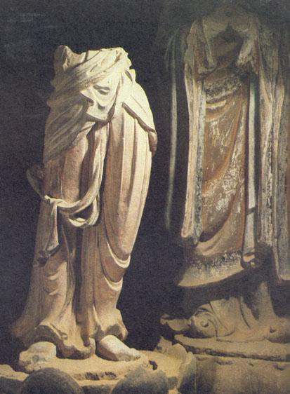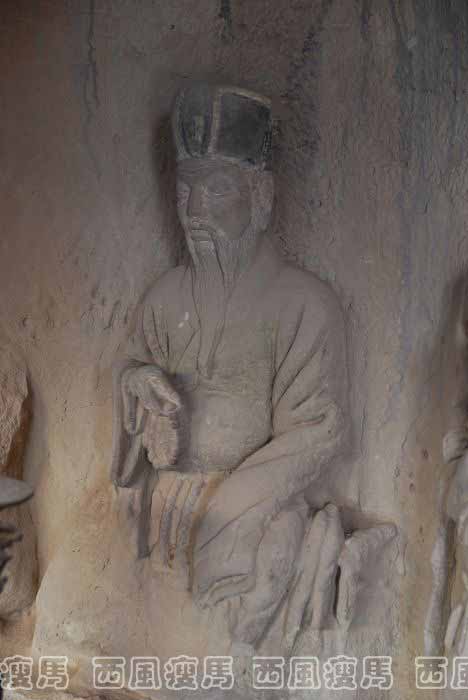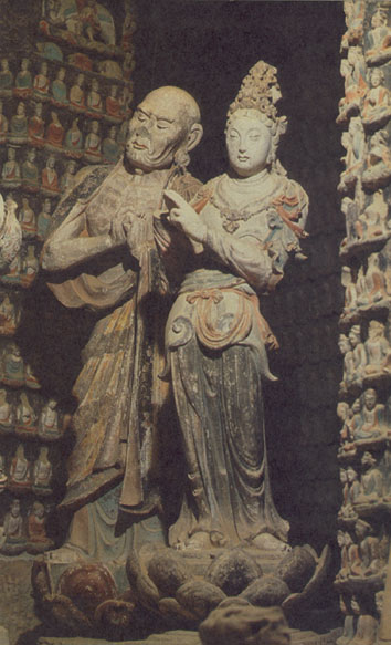 王窟之东两窟内均为小窟,都有造像。第4窟的造像主要集中在右壁,上部前端有一佛二弟子十菩萨龛(图215),佛居中间,左右各一弟子五菩萨立像。龛上两端还各有五佛,合为十佛。龛右有北宋政和二年(1112)的自在观音像(图216),观音游戏坐于山崖之中,左侧放有净水瓶,下有几位供养人和马。壁面中部左为游戏坐观音,中为文殊普贤菩萨,右为一佛二弟子二菩萨龛和一佛二立菩萨龛,佛为善跏趺坐弥勒。壁面下部已严重风化。第5窟后半部被泥墙堵住,从空隙处可看见有佛与供养人造像。右壁造像尚存,中央龛为禅定坐佛,左右为二弟子,惜三像头已缺。壁面其它地方主要刻罗汉像,间有自在观音,罗汉均坐山崖中,可见的数量在三十尊以上,其中有的伴有猛虎,即后来所渭“伏虎罗汉”。第5窟和第4窟的开凿时间,大约部是在北宋后期。