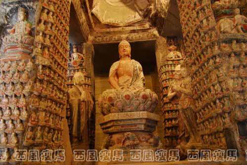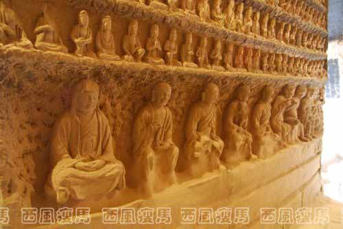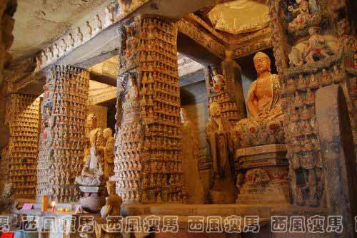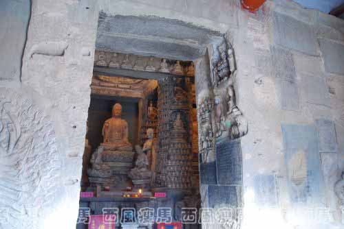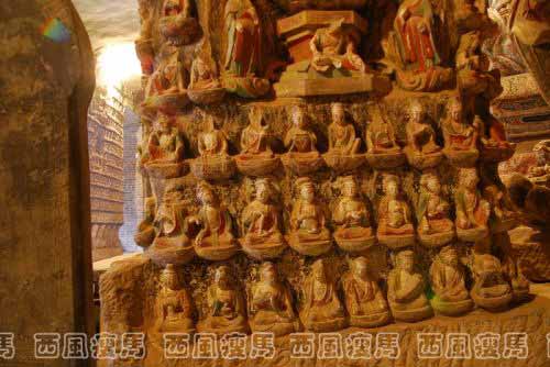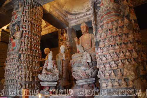 佛坛上八根立柱亦刻有千佛和小龛造像,每根立柱上下排列着18至20排小千佛,其中参杂有游戏坐观音、文殊和普贤菩萨。十佛和十菩萨立像。后四柱的背面未刻像。中央门洞左右侧过道分别刻有文殊骑狮和普贤骑象龛,其中左侧过道的华严三圣龛分上—卜三层:上层为结跏趺坐的释迦佛和二弟子,中层为骑象的普贤和骑狮的文殊以及昆仑奴,下层刻一供养人跪坐云端双手上举,像旁铭文纪年为北宋末的靖康元年(1126)八月。