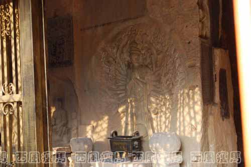 主窟外壁,即门洞两外侧亦有龛像。西壁是干手千眼观音,观音手臂由内向外分为四层,内层共刻有四十佘双手臂,外层另有百余双手。内层手中各持法器,其中最上二手托举佛像,中二手合十于胸前,下二乎捧钵于腹际。千手观音刻造得十分精致,比例适当,层次分明,排列有序,由内向外逐渐减弱为浅浮雕。但面相方圆。已不似北宋菩萨的长脸型,从题汜看,其凿造时间已在元代至元年间(图114)。