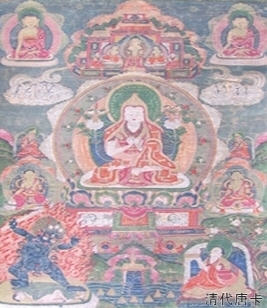 唐卡。清康熙十年(1671),寺主持喇嘛侯只请青海保安画师绘制的。上为香巴佛,中为宗喀巴及其弟子,下为四护法。