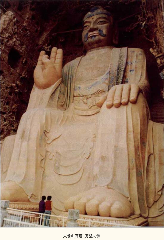 大象山石窟始凿于北魏,先后共经历了四个朝代,三百多年,一直到唐更趋完美,其中甘古大佛释珈牟尼佛造于盛唐,身高23.3米,腰宽10.4米,和颜善目,仪容庄重,体魄雄伟,斜披袈裟,结跏趺坐于莲座之上,安详而宁静地迎接来往游客。