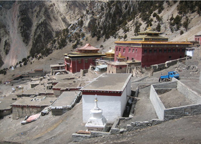 “达那山”(意即“马耳山”)下是一片沙土地带,颗颗沙粒在阳光下闪闪发光,再下面草坪如茵,相连着茂密的松柏林,寺院即在林间。寺前一片河柳和灌木丛。清澈的麦曲河自山根缓缓流过,这里山势极其险峻,但又风光着实迷人,不失为青藏高原一处修心养性、闭关禅定的好去处。为与印度格本日地方的达那寺相区别,此寺也称“北部达那寺”。