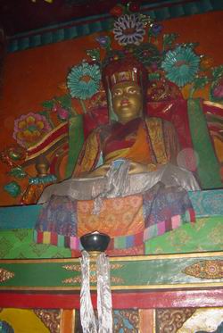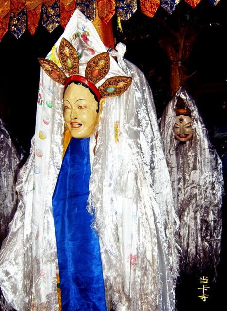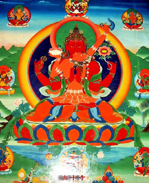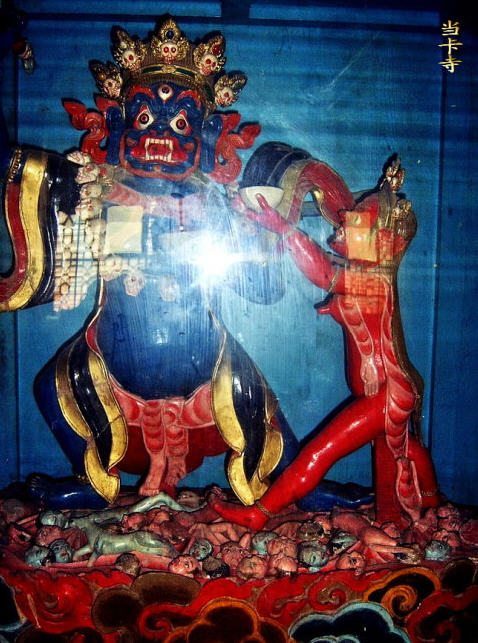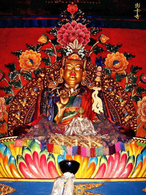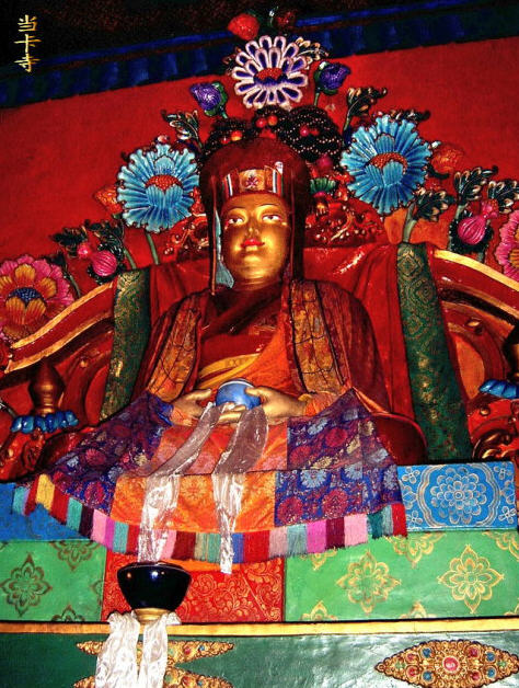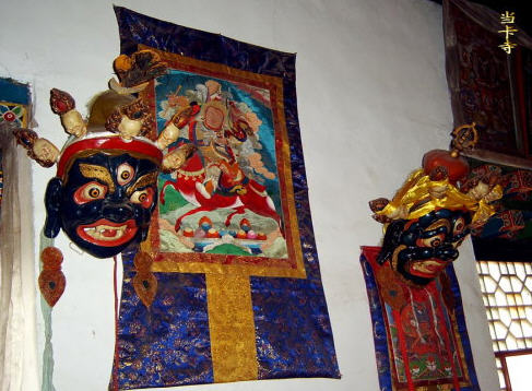 当巴查道代开始在附近寻找建寺之地,初抵布巢格(Butsakger)。其亲见本尊观世音菩萨,而且有非人献上自然显现的白色的观音石像。随后抵至热格加图(Rage Kyatok)﹑拉乌布(Rawuphu)等地观察,但均无建寺的佳兆;于是巴查道代再度返回修行的山洞,请求护法。嗣后有一飞鸟至,叼走供护法的多玛。巴查道代尾随飞鸟,沿山洞右侧经一河流处,到达山洞对面山谷。一状似观音菩萨憩卧时的心窝位置,其处有一巨大石头(其石大如房室般)。飞鸟将多玛停放在石头上,剎时有许多灵异神奇的征兆显现,同时阿塞佛母(注:护法之一)现身迎接,表示欢跃之意。自此阿塞佛母成为当卡寺的护法迄至于今。在那巨石下方附近,有一片白色泥沼地(注:当卡即藏文白色泥沼之意。此地甚为吉祥,莲花生大士曾亲自加持此地),巴查道代于是在此地建寺。建寺时,因缺乏水源,巴查道代以其拐杖插入土中,地上乃自然涌出水源。(注:此水源现今仍为寺内重要之甘露法泉)。
