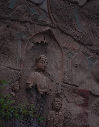 拉稍寺创建于北周,又叫大佛崖,与水帘洞隔山相对,寺内保存了大量北周至元代的石窟艺术作品。陡峭的崖壁上有浮雕3尊,中间的大佛高达40余米,是目前中国最大的摩崖浮雕。两旁是手持莲花躬身肃立的胁侍菩萨。佛坐莲台上,莲瓣间层刻有狮、鹿、象,或站或卧,排列对称,雕琢古朴,形象生动,造型艺术水平较高。周围诸多佛龛伫立着宋代小佛像。崖面上部向前突出,又加筑风檐以蔽风雨,檐端雕刻飞云走兽,悬挂铜铃,微风过处,叮铛作响。其造型留有小乘佛教的痕迹,在我国石窟艺术中实属罕见。