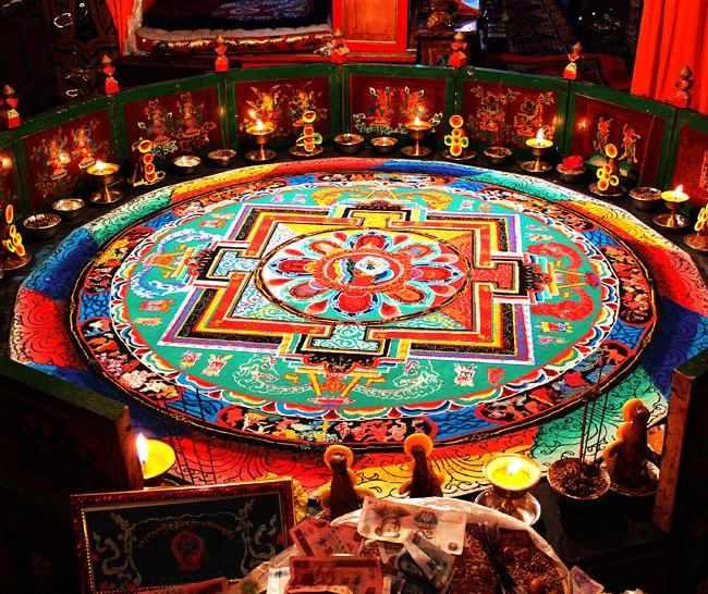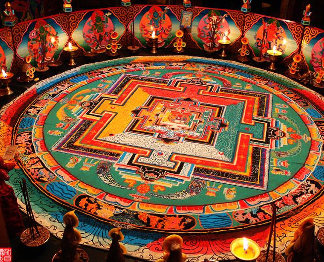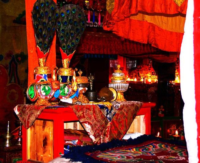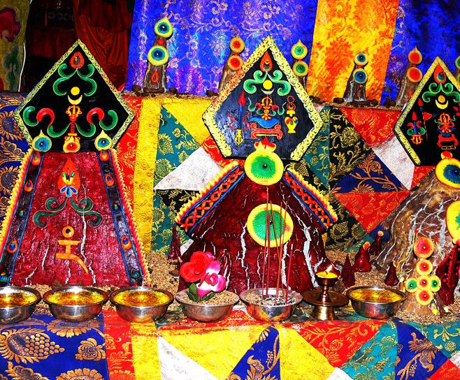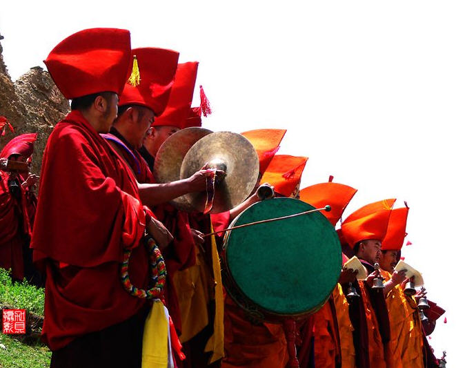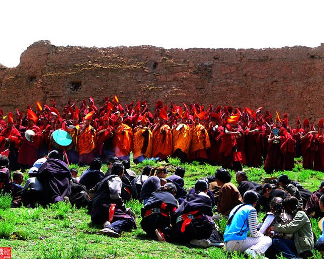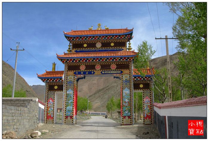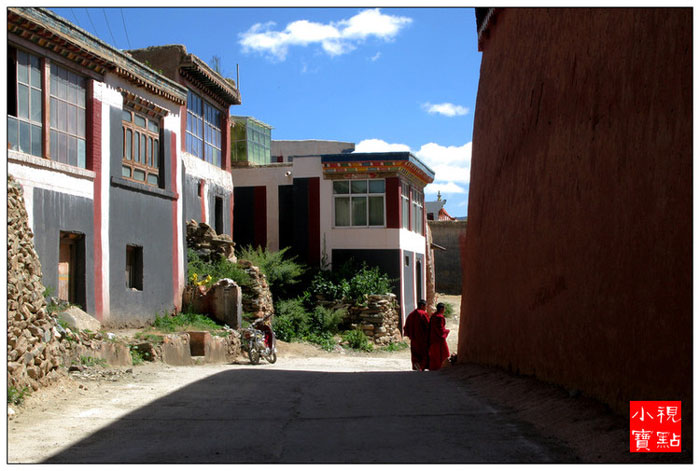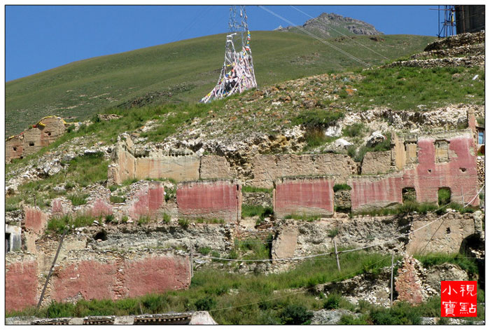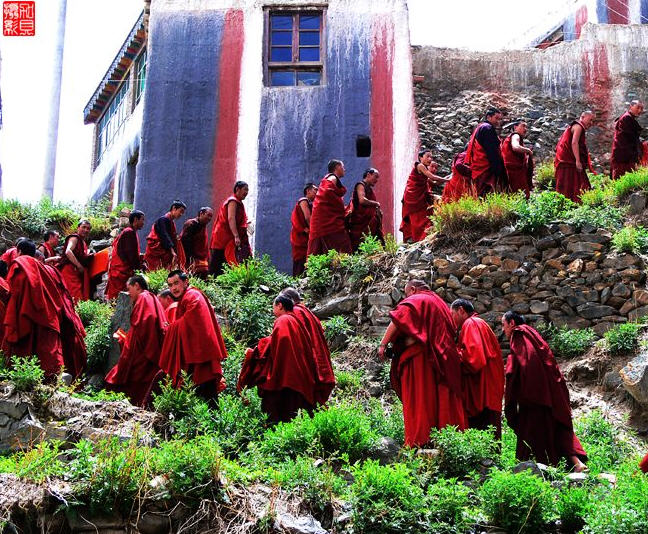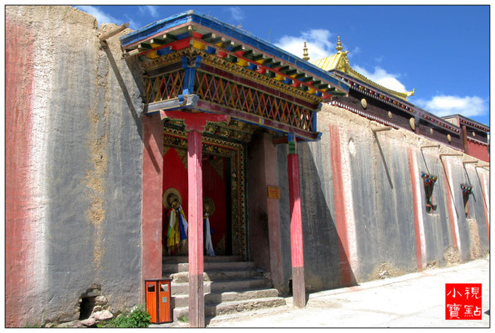 迦派寺院围墙上会涂有象征文殊、观音和金刚手菩萨的红、白、黑三色花条。