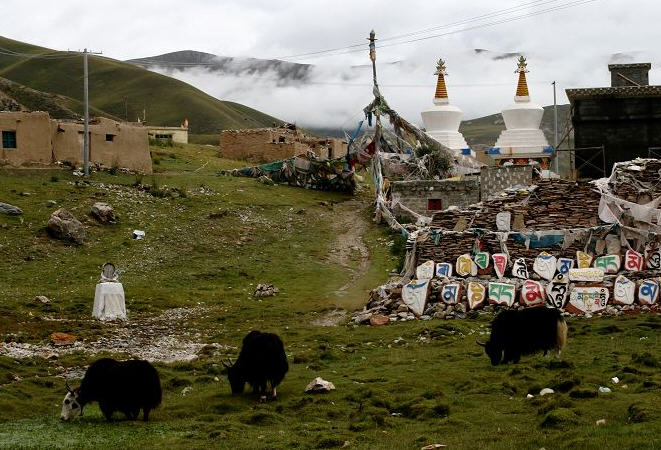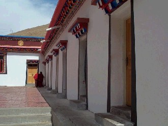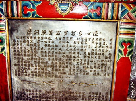文成公主庙里面是一个白粉刷墙、卵石铺地的“凹”形小院,庙门旁有一块不大的石碑,用古藏文简略地记载修筑文成公主庙的缘由和大体时间。