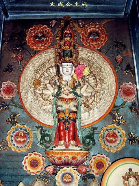 此外,庙堂内东西墙壁上有两组大型壁画,画面内容主要是当时文成公主进藏路过白纳沟时,当地藏族头人和群众如何隆重欢迎的动人情景。
