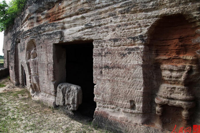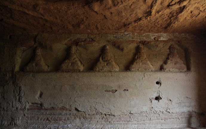 1号和5号窟已遭破坏,造像不存;2~4号窟保存较好,平面均呈长方形。2号窟宽4.1、进深5.8、高2.95米,主佛像已毁,两壁各有二排5个圆拱浅龛,上排龛内均雕半浮雕佛像1尊,下排龛内均雕文官像1尊。3号窟宽4.5、进深6、高3.6米,两壁均凿有三排圆拱浅龛,上两排每龛有坐佛1尊,下排为武士像。4号窟宽4.1、进深5.8、高2.9米,主像已毁,两壁各有两排圆拱浅龛,上排龛内均有半浮雕佛像1尊,下排龛内各有造像1尊。