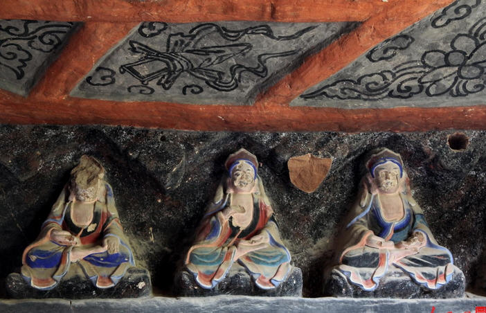 3号窟深6米,高3.6米,宽4.5米。正中佛像亦佚。两侧墙壁均有三层浅龛,第一层分别为5龛,第二层为6龛,此两层每龛内各雕坐佛一尊。佛皆跏趺盘膝,袒胸,有的合掌胸前,有的袖手置膝,其面目神态各异,沉思者,含笑者,若有所悟者,蕴而不露者,均较逼真传神。第三层为一通长方形浅龛,内雕10尊武士立像。众武士有的披甲胄,携武器,有的徒手握拳,或怒目而视,威武雄健。在门内两侧雕有佛、弟子和菩萨8身。总计此龛现共保存雕像50身,是该窟中造像最多的龛。