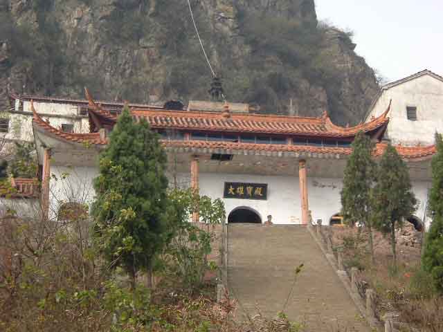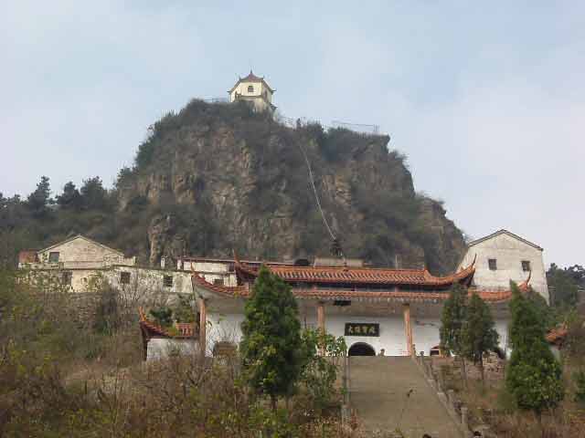 寺院周围,林茂木葱,奇花异草,千姿百态,景色宜人。更有奇者,在寺院山顶有一巨石,悬于半空,石身高丈余,仰观有顷刻降落之险。相传此石是地藏菩萨夜深人静之时盘坐悟道之处,有诗一首: