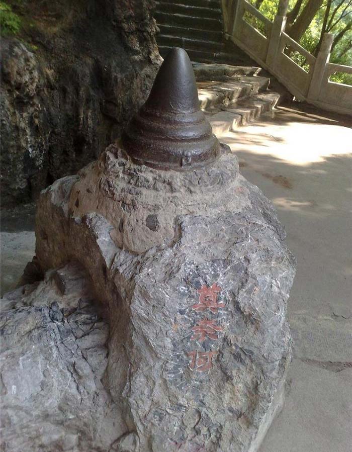 玉柱,在后洞的睡佛旁边。是直立着的一根天然形成的钟乳石柱,仿佛支撑着整个天然洞穴。据说,摸了“石柱”可以成为栋梁之材,游人纷纷扶柱相 摸,久而久之,使这根天然的石柱日益光亮,银光闪闪,故人称“玉柱”。“莫奈何”在前洞的飞来石旁边,是一个形状怪异的东西,由生铁铸成(铁砣),呈盘旋 尖顶状,共分5层,由底层而上,层层收敛,形成一浑圆尖顶。高32厘米,底围104厘米,重约75公斤。人们来专烧香拜佛或游玩,都去摸这个铁砣,以试自 己的臂力。但因抓无处抓,抱又不好抱,而且不易掌握平衡,故而都抱不起来,于是就将此物叫“莫奈何”。