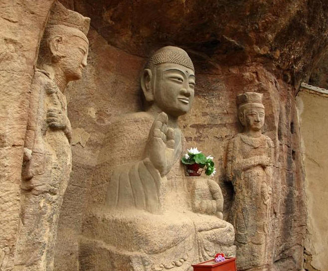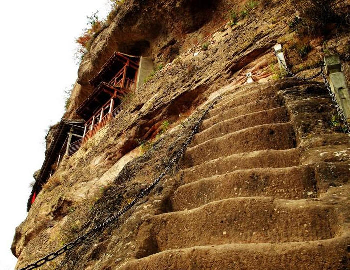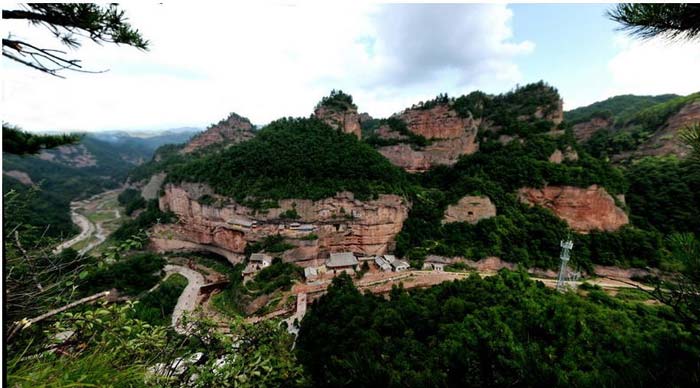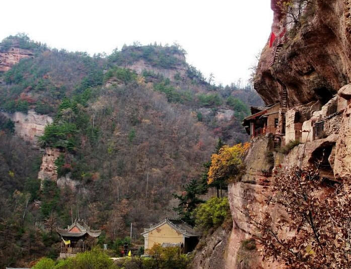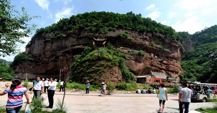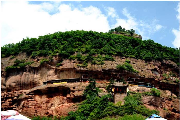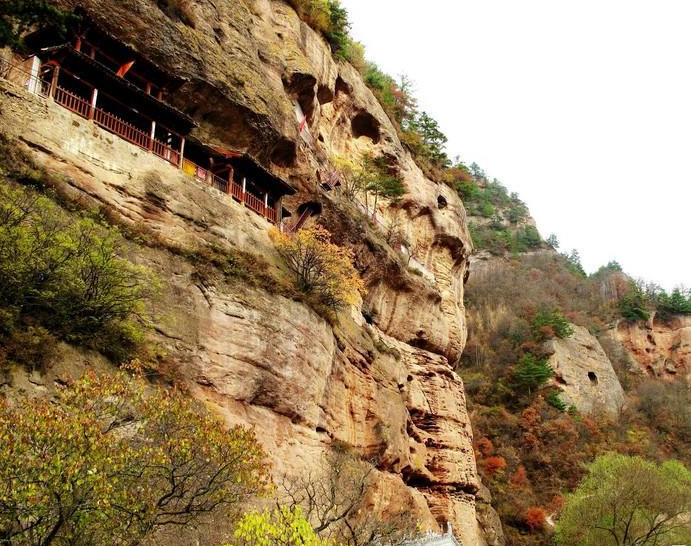 云崖寺云崖寺现辟有八寺、三洞、一湾、一潭。八寺为云崖寺、大寺、红崖寺、竹林寺、西寺、乔阳寺、金瓦寺、佛沟寺;三洞为三教洞、罗汉洞、千佛洞;一湾为殿湾;一潭为滴水潭。云崖寺众山环拱、一峰突起、其峰三叠,高达150米。石窟雕像分布于三层悬崖之上,共有云崖6龛,石造像55尊,壁画16平方米。题记三处,明碑2块,其第一层为"白云洞",相传为山憎法印所辟,有"朝夕多云、而云多白、洞中出云、洞上盘云、洞前驻云、洞底的奇观。过去有梯可攀,而今梯秀路绝,无法进洞。第二层洞窟较多,有西洞残留北魏、北周石造像12尊。其中有一座高32米的塑像,造像端庄古朴,雕像严谨功精,有较高的艺术价值。
