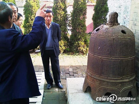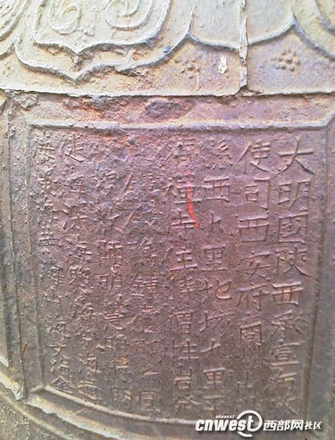 大云寺内存着一口铁钟,是馆长从山阳收回来的。钟上刻字记事,字体很漂亮。