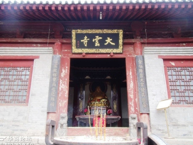 清代改做启秀阁,成为商州“八景十观”之一。清人王时叙《远山诗草》中赞此阁道:“千峰万岫走商城,金凤山高旧有名,一白菊溪开秀阁,梵声不听听书声”。 明初毁于兵燹(xian,音显),清顺治十八年(公元1661年)建新寺于城西门内,仍号“大云寺”。原寺为“上寺”,新寺称“下寺”。光绪三年(公元 1877年)知州李素募捐大举增修,工未竣去任,至光绪二十六年(公元1900年)知州焦云龙始将其全部建成。现存前殿、中殿、后殿各5间,厢房40余 间,占地20多亩,屋面经过改建,多失去原貌,唯梁架依旧。三座大殿座北向南,以山门为轴对称,总体布局是一座四合院式的高宇建筑群体。今天当你来到这个 清静幽深的寺院,踏上石阶,穿过山门,步人大殿,那红柱画壁,尤其是内侧斗拱间绘制的佛像,栩栩如生,引人人胜。殿外株株苍劲挺拔的古柏,增添了寺院之幽 雅。通体墙镶嵌“大云寺”砖饰,浑厚而古朴。元代的一尊石雕造像,束高髻,戴桂冠,裹金裙,披大巾,系薄带,侧身仰面相迎,一佛怀抱小孩,乘坐莲花宝座, 玉带飘逸,流云环绕,腾云驾雾,反映了当时佛教的崇高地位和人们对佛教的虔诚。大云寺古而又奇。唐末农民起义首领黄巢率军取道武关,曾宿于此;明末农民起 义领袖李自成破商州,也在此驻留整军,后而挥戈东进。游人来寺,莫不感叹寺之宏伟壮观。