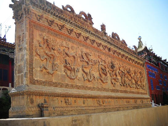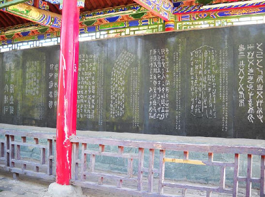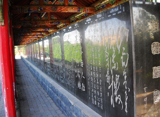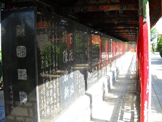 南碑林在观音阁南,该碑廊长40米,木架结构,画栋雕梁,顶覆琉璃 瓦。碑廊北头有两层叠加圆塔状建筑,犹如龙首,观音阁如宝珠,与后建北碑廊构成“二龙戏珠” 态势。碑廊中部横砌贯通南北之碑座,其中高50厘米,其宽65厘米,石碑座上先筑50厘米厚、1.4米高的砖墙,然后在墙体两面用水泥粘贴黑色花岗岩板 材。其面积为宽40厘米,高1.4米,其厚度为2公分。所刻文字先将所收集书法作品在电脑上按要求大小放好,然后在其下方衬上复写纸,描在碑石上,最后由 石工精心刻制。南碑廊供贴碑石122块,总投资10多万元,其中姜玉英女士(80多岁)捐资4万元,不足部分由寺内布施补之。北碑林在观音阁之北。其形制 与南碑林大同小异:碑廊南头筑两层叠加八角塔状建筑,亦犹龙首,总长50多米的碑廊犹如龙身。与南碑廊不同者是北碑廊北部向东拐出10多米。北碑廊内树碑 石块133块,在尚永东、谢志忠先生资助下告竣。设计、主持、总监同前。北碑林与南碑林紧密呼应,大观毕现。北碑林采集挖掘历代或现代名人名言、名录名 句、名书名品既增加了景观又把无量寺变成榆林的文化宝库,使之将现有占地全部利用建成一寺多庙多殿的完整庙宇。建筑方面展示了榆林人民勤劳高超的技艺,启 发信众对神灵追从扶正除恶和行善积德的美好愿望。