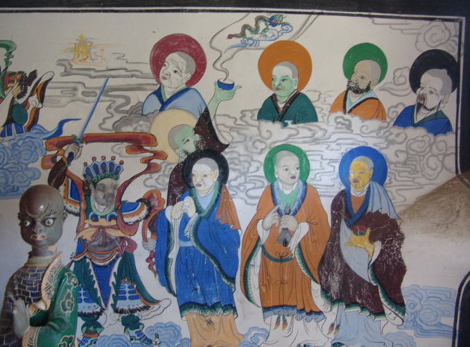 从龙泉寺揪着柴草攀援而上,不仅百米即达石窟 所在。一条石砌小道或上或下、或平或陡,或宽或窄,把8个石窟串连起来。保存较为完好的7个皆为方型平顶,顶部錾迹分明。窟顶藻井多以阴阳八卦、花鸟走兽 为饰。神台神座多为就石凿成,其上图案古朴,彩绘清晰,两侧壁画造型生动,色彩明丽,保留了明清风格。保存最完好的是玉皇大帝石窟,窟内正中神座上雕有一 尊玉皇大帝坐像,除头部外,整个身躯均为纯石打造,且和背靠、神台、神座连为一体。坐像高1.1米,坐姿端庄,仪容清秀,宽衣博带,线条流畅。背后石靠中 上部边角各有兽头1个,正中上端雕有盘龙一条,中下部及两边饰以名花灵木。窟顶藻井以两个正方形套成八角图案,中间为阴阳八卦,四周雕有鹿、鹤、玉免、凤 凰等;神台前壁正中雕有二龙戏珠图,二龙盘曲有致,其间以鱼、鸟点缀,上部两边刻有“寿”、“福”二字,中间朱雀殿翅飞翔,下部两边雕作翻卷桌腿状,表神 台即供桌之意象。石窟两壁画有14个人物,每壁前5个皆头戴平冠,手握笏板,后两个头巾纱帽,其中1个戴金盔,披铠甲。人物均仪容丰腴,衣带飘飘,貌极谦 恭。其画技之高超确实少见。最壮观的石窟当为真武祖师殿。其石窟高4米,深8米,阔7米。神台正中赵武祖师像褐面金身,两目炯炯,貌极威严。背靠作梅干屈 曲状,色呈紫褐,间或有梅花点染其间。头顶藻井不穹窿形,图案内外三圈,由八卦、人物、奇花异草、灵兽等构成。台左所侍周公双手挥旗,台右所侍桃花小组双 手胞于腰前,发髯拧成两绺,向上卷起成环状。台下正前两边有站殿二将军,手握蛇矛、长枪、盔甲鲜明,威武无比。两侧塑有十殿元帅,个个身高腰阔,手握各式 兵械,或狰狞,或威猛,让人不可逼视。据说过去此窟暗设机关,人进窟内触动机关,神像眼珠转动,兵械摇响,惊心动魄。石窟正中有两根就石錾成周长两米多的 方形石柱,直抵窟顶。石柱上各塑有青、黄盘龙一条,龙目暴突,龙口大张,尖爪利牙,十分骇人。两壁绘有42幅真武祖师行善身图,绘图精工,人物栩栩如生, 表现出较高的绘画水平。