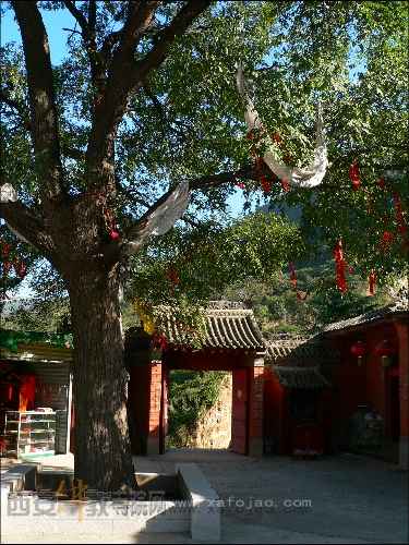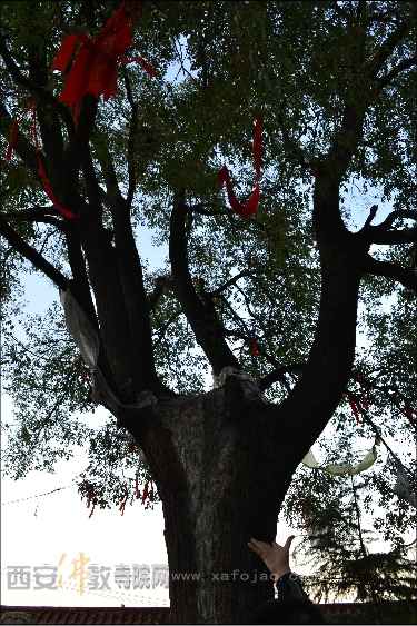 古槐树:此古槐树高数丈,树围一抱,为西安市古树名木。树枝呈张开的手掌样。传说当年关羽到此一游,见寺内师傅练剑是出神入化,就跪地想拜师学艺。师傅见关羽学艺心切,就答应教他功夫。关羽一高兴,从地上拔出青龙偃月刀,一刀砍到树上,从此这棵槐树就成为五指张开的样子。后人见关羽有如此护持寺院的威神力,就把关羽奉为伽蓝菩萨(护法藏菩萨),供养在寺院里。这棵树又像佛手,拔地而起,象征着佛祖想让众生脱离六道轮回,解脱众生烦恼的愿力。
