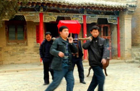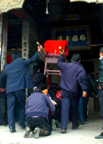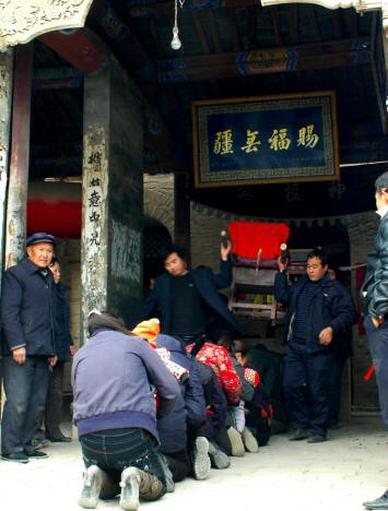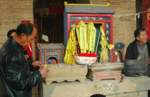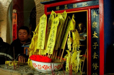 正殿呈硬山式,是山上最高大的建筑。殿内真武祖师神 情端庄,面目安详,令人不觉肃然;站殿守护神哼哈二将孔武威猛,不可逼视。整个大殿笼罩着莫可名状的神秘。且不知有多少香客为祈求这浩荡神恩的庇护则慷慨 解囊。正殿后面正中为九天玄女娘娘庙,据说求子奇准,每有灵验,左右两侧庙中,分别供奉着救苦救难的观世音菩萨和佛祖释迦牟尼。观世音菩萨庙内的几块石 刻,线条粗犷,构图古朴,风格与今大不相同。老高说,这几块石刻人原庙址中挖出,然终不知为何朝何代之物。