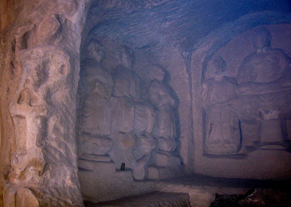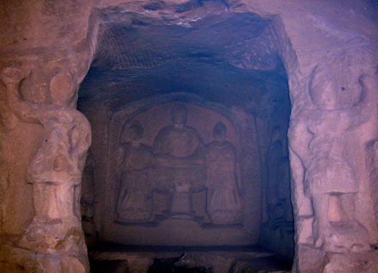 石寺洼石窟位于横山县白界乡陈家沟村北0.6公里处的半山坡上,石窟座西南向东北,窟前田畴交错。窟东约0.8公里处榆溪河由北向南缓缓流过, 窟东1公里为西-包公路,窟西距横山城80公里,北距榆林城仅20公里。石寺洼石窟营造时代,因无碑刻佐证,又无史志记载,只根据窟的凿造方式、造像组 合、服饰比较、刻技等综合分析,初步确定为北魏晚期。石窟呈方形,平顶微拱,进深1.47米,宽1.48米,高1.68米。窟内三壁环坛,坛高约0.15 —0.2米,坛上方三壁各凿一拱形大龛(俗称三壁三龛),龛高1.1-1.28米。龛内凿刻一佛二菩萨,佛像通高1.28米,高肉髻,身着交领右衽衣或通 肩衣,结跏跃坐于仰莲须弥座或呈舒相坐式,衣裙遮蔽台座。菩萨袒胸露臂,胸饰璎珞,璎带绕身,下着羊肠大裙,裙脚外展,跌足全力于高低仰莲座上,多呈双手 合十或两手交拢于胸前。窟外对刻二力士,头戴毡帽或束髻,身披战裙,大眼园睁,两耳垂肩,相对应的一手叉腰,另一拳高举,左力士踩牛,右力士踩象,神态威 严凶猛。 刻技以直平刀法为主,圆刀较少,刻线多呈阶梯形,线条较为密集。佛和菩萨座多为高低仰莲须弥座,造像头大身短。二十世纪九十年代,村民炸石筑窑,将石窟前 室炸毁。后石窟前原有石雕斗拱,窟檐被敲掉,石窟造像也因人为与自然的破坏,保存现状较差。
