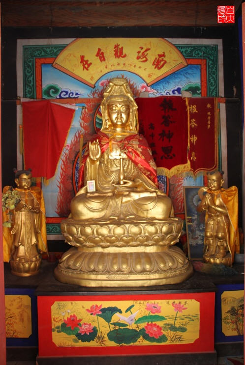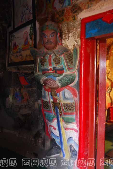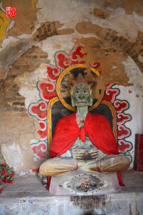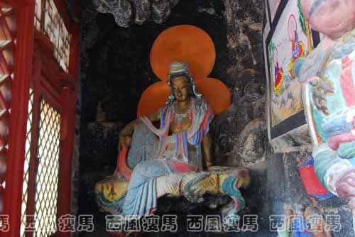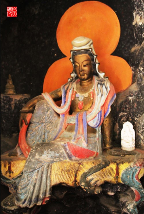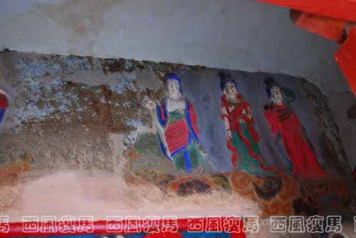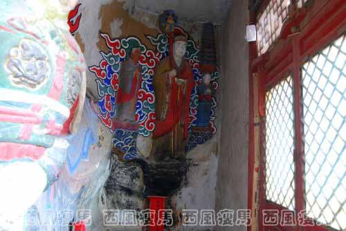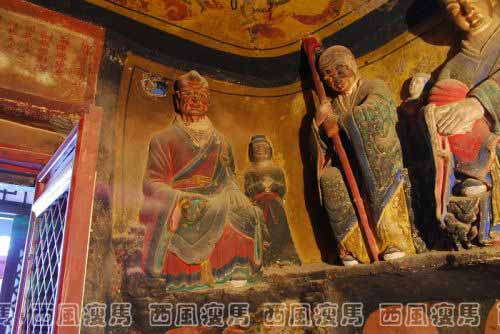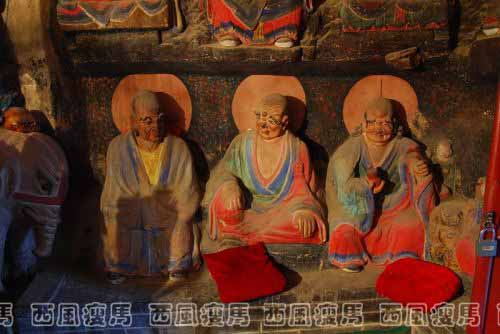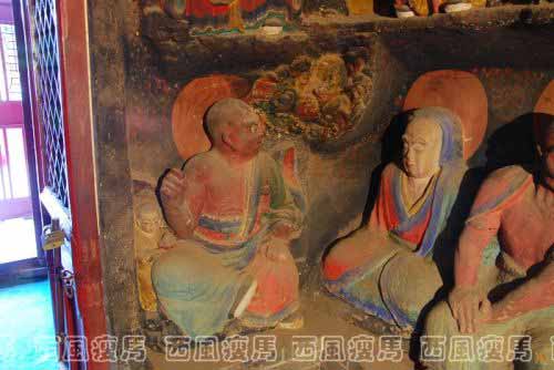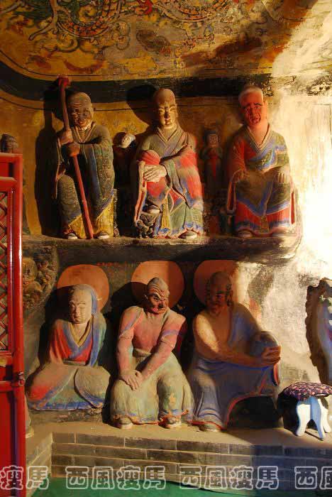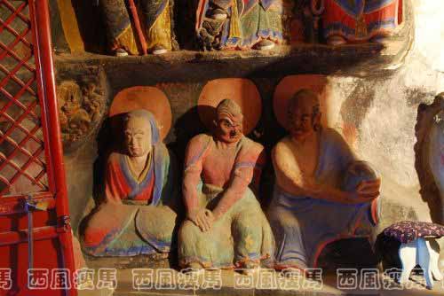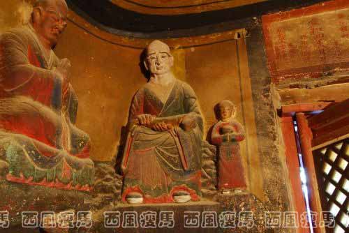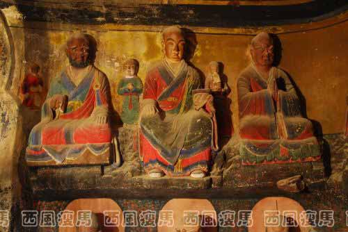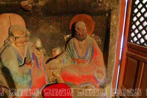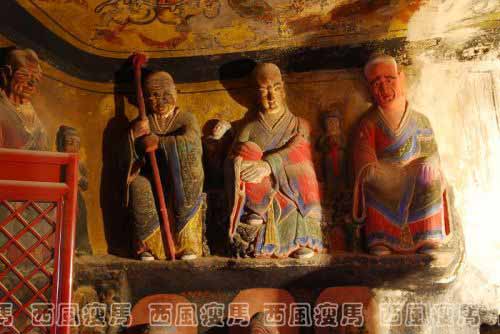 佳县云岩寺石窟位于佳县木厂湾村北,仅一窟,窟宽3.6米,深3.4米,无中央佛坛。正壁造像为释迦牟尼佛,左为迦 叶、右为阿难,普贤骑象和文殊骑狮分列左右角,左右壁为罗汉,分两层,每层四尊,共为十六。窟顶有圆形图案,中为莲花,外有八卦和龙。外壁门上有六尊立佛 和菩萨(图240)、布袋佛像(图241)、地藏菩萨和观音像,门左右有二天王。开窟题记如下:“都维那杜应、副维那张在……石件洞修释迦如来佛、十六罗 汉石洞,普遍十方修功毕,同增福利,并生程结。李子贞。宣和四年(1122)八月日。修宇人刘礼,石匠四人,李荣贤、雷人立、张靖”。窟中造像现已重新涂 彩描金。