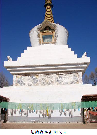 在黄河源头,碧波万里的彩带上镶嵌着一颗璀璨的明珠。一千多年来,她犹如一尊神勇力士,气势磅礴、雄伟壮观,给青海的“小江南”贵德县增添了无比的光彩;她授三世佛加持,坐落在三界众生积善的福地;她以雪域历代藏王中对佛法侍奉最为虔诚的赤热巴坚的头发为塔藏,殊胜无比;她相传是印度阿育王号令财神瞻婆连夜造就的世界一千万座佛塔之一,功德无量。她就是三界弥足珍奇的乜纳白塔。近观者有雍容华贵、慈祥安然、自强不息、直上云霄的感觉;遥望者,会产生无忧无虑、心旷神怡、喜不自禁、自豪荣耀之情趣。在此真心的祈祷乜纳塔永驻人间!