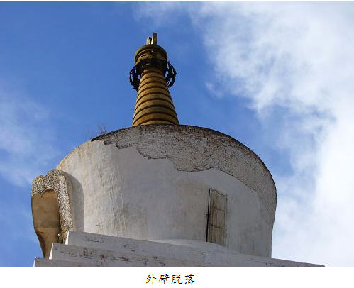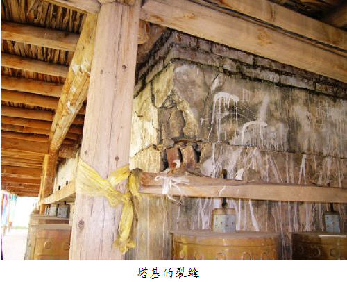 公元1990年4月26日,青海省海南藏族自治州唐河地区发生地震,余波危及白塔,塔基四周墙面相续裂缝,白塔逐渐开始整体倾斜,并且塔基逐年下沉,如今塔身东北面开裂达五指宽,曾多次发生水泥结块剥落伤人事故。据专家分析,塔基内由土料填充,而乜纳塔坐落在黄河沿岸,土料受潮、受压,致使内部土方平衡下垂,塔身多处松动,随时会有倒塌的危险。
