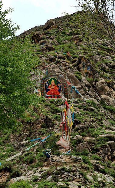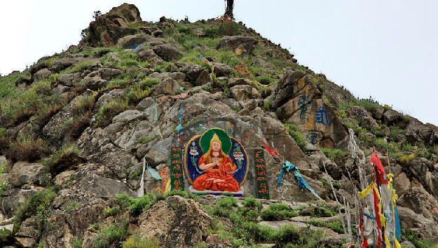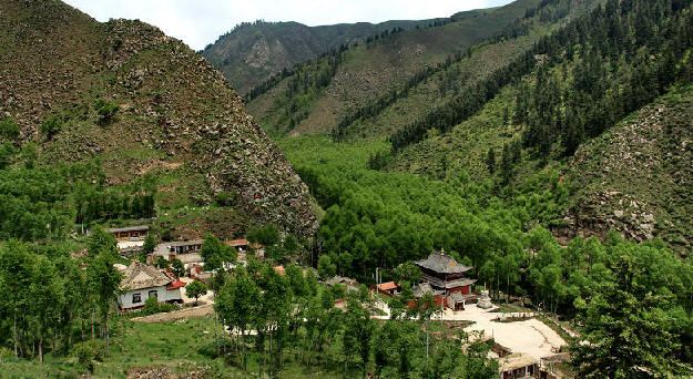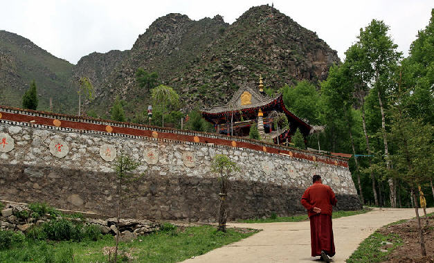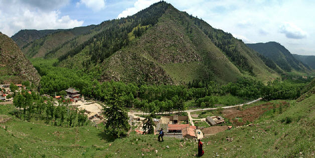 羊官寺藏语称为“东霞扎西曲林”,意为“北峰吉祥丛林”,位于乐都县北山寿乐乡羊官沟。当地人称其坐落的山形为“凤凰三点头”:凤凰山山势险峻,怪石鳞峋,山呈凹字形,北面山峰高高耸起,如同凤头;两边山沟形同凤须,微微翘起;东西两山形同风翼。山上灌木丛生,山花烂漫,远远望去,山形宛如一只巨大的彩凤,跃跃欲飞。南面照山名曰“狮子拜佛”,山上古树参天,郁郁葱葱,恰似一头猛狮摇着绿鬃在拜谒佛尊。那南山北山的峡谷间,泉水潺潺奔流,清澈见底,给幽静的山林增添了无限生机。羊官寺,就坐落在两山之间的山坳里。