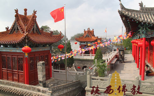 去年冬日,我的大学同学蔡君来榆旅游,他请我导游,浏览名胜古迹。戴兴寺近在咫尺,遂成首选旅游景点。时值正午时分,我俩来到“三山拱翠”的戴兴寺山门 前。门前竖立一对8米多高的石旗杆,并有一对两米高的石狮雄踞左右。门上额题“戴兴寺”三字苍劲工稳,系我国佛协主席赵朴初1985年所题。跨入山门,正 前方照壁有一铜嵌“佛”字。门北侧有硕大槐树一株,高可8米,虽然花叶凋落,但在冬阳下虬枝劲拔。这株时跨数百年、城内独存的古槐令人敬畏。榆林民间一贯 对槐树尊崇有加,这是因为本地人的先祖大多系明朝时从山西移民而来,流传至今的民谚云:“若问家乡在何处,山西洪洞大槐树。”
