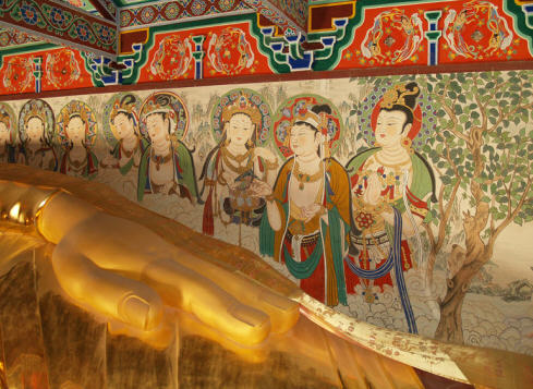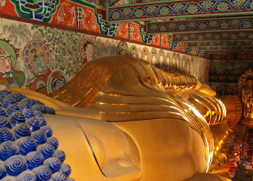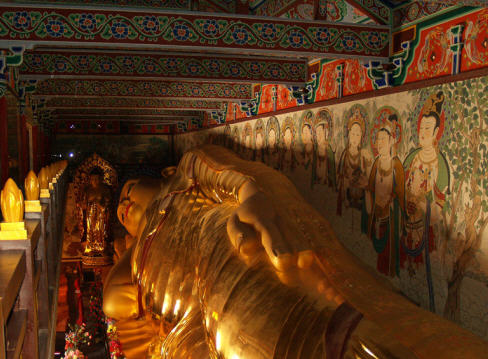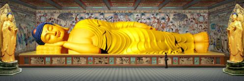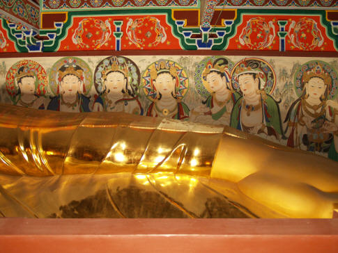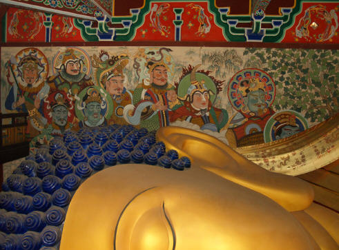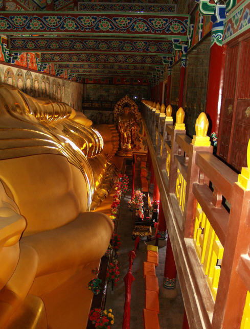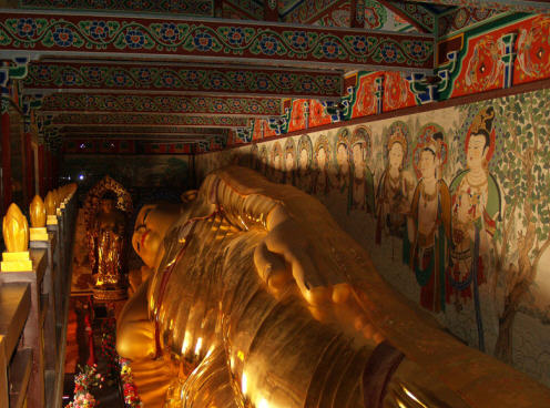 卧佛是佛的涅槃像,依释迦佛涅槃时的情形塑造的。面南头西,侧身卧,双脚伸直并拢,左手置身体上,右手支颐,双目微闭,自在安祥。卧佛殿於2002年8 月底由市古建一公司承建,是一座综合性双重檐殿堂:上层为藏经阁,下层为卧佛殿,地下为关煞洞。卧佛殿东西九开间,共长40.8米,宽13.5米,内塑卧 佛长108尺,计36米,完成后将为目前全国最大的卧佛。