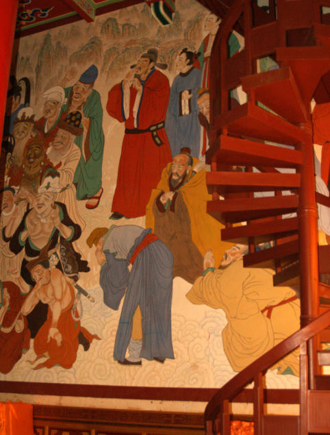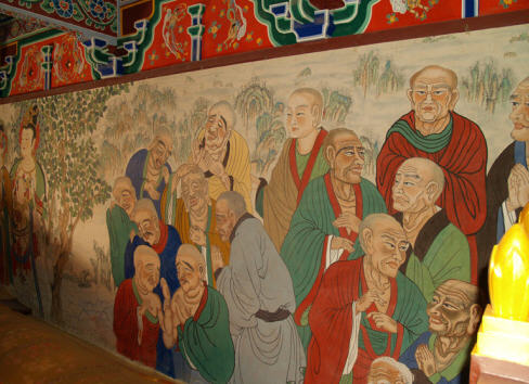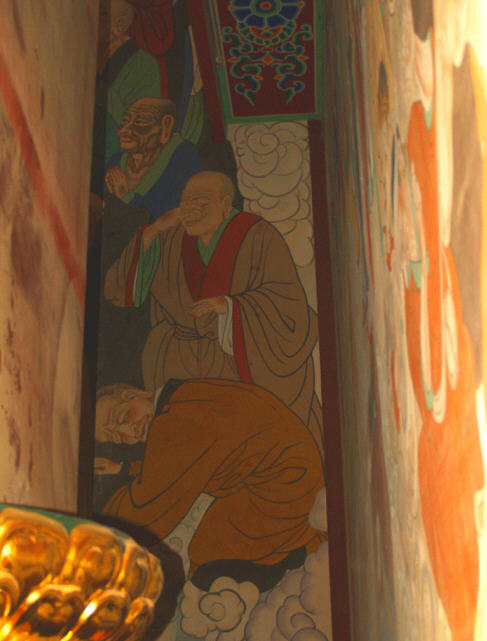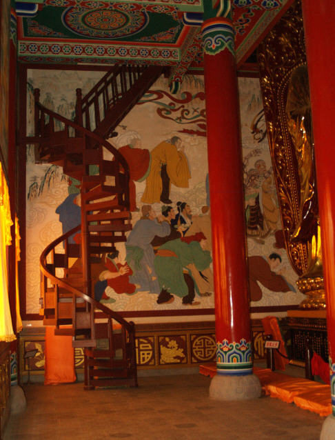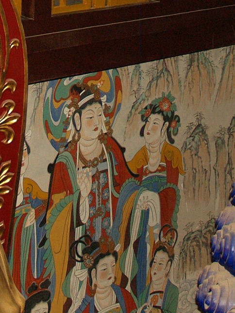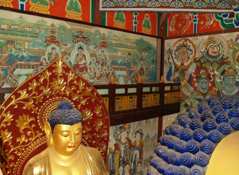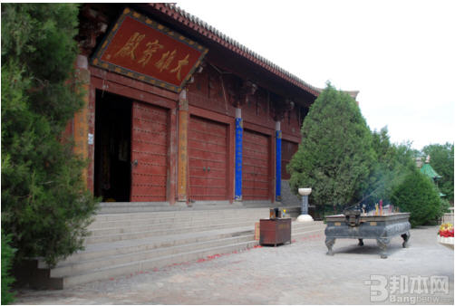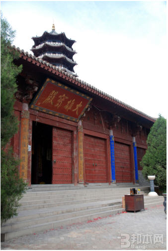 大雄宝殿即是正殿,或称大殿。大雄是称赞释迦牟尼佛威德高上的意思。释迦牟尼佛是佛教的教主,二千五百年前印度释迦族的一位王子出家成佛,建立了佛教, 所以称为释迦牟尼佛。释迦牟尼佛像有各种不同的姿式,主要的有两种:一种是结跏趺坐,左手横置左足上名为‘定印’,表示禅定的意思;右手直伸下垂,名为 ‘触地印’,表示释迦在成道以前的过去生中,为了众生牺牲自己的头目脑髓,这一切唯有大地能够证明,因为这些都是在大地上作的事。这种姿式的造像名为成道 相。一种是结跏趺坐,左手横置左足上,右手向上屈指作环形名为‘说法印’,这是说法相,表示佛说法的姿式。另外有一种立像,左手下垂,右手屈臂向上伸,这 名为旃檀佛像,传说是佛在世时印度优填王用旃檀木按照佛的形容所作。下垂名‘与愿印’,表能满众生愿;上伸名‘施无畏印’,表能除众生苦。后来仿照此形象 制作的也叫作旃檀佛像。