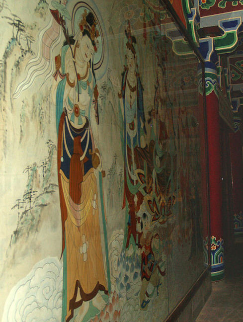 这是三门内的第一重殿,殿中间供弥勒菩萨。弥勒菩萨像后供韦驮菩萨,面向北。 东西两旁供四大天王像。四大天王东方天王名为‘提多罗吒’,此云持国,能护持国土,领毗舍阇(此云颠狂鬼)、乾闼婆(此云香阴)神将,是帝释天的主乐神, 所以此天王手中持琵琶以作标帜,护东方弗提婆(此云胜)洲人民。南方天王名‘毗琉璃’(此云增长),能令他人善根增长,所以手中持剑,领鸠槃荼(此云雍形 鬼)、薜荔(此云饿鬼)神,护南阎浮提(此云胜金,亦云瞻部)洲人。西方天王名‘毗留博叉’,此云广目,能以净眼观察护持人民,领诸龙及富单那(此云臭饿 鬼),所以手中缠绕一龙,护西瞿耶尼(此云牛贺)洲人。北方天王名‘毗沙门’,此云多闻,有大福德,护持人民财富。右手持伞,表福德之义,护北郁单越(此 云胜处,亦云俱卢)洲人(见《长阿含经》卷一二《大会经》)。世俗称为四大金刚,这也是《封神演义》中的戏言,金刚与天王是不可混淆的。