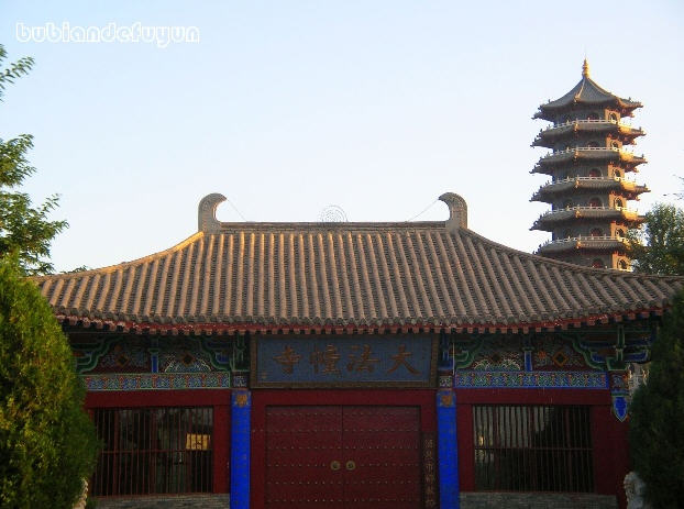 大法幢寺位于肃州城北郊二公里处讨来河畔的北崖梧桐湾,重建於1984年,为肃州城内大法幢寺(又称钟楼寺、救生 寺,为明清以来河西地方的重要寺院之一,及当时肃州城内最大的佛事活动中心,原为肃州八大景之一,惜因历史在因毁於一旦)之再建。寺依宗而名,宗名法幢, 寺亦名法幢。